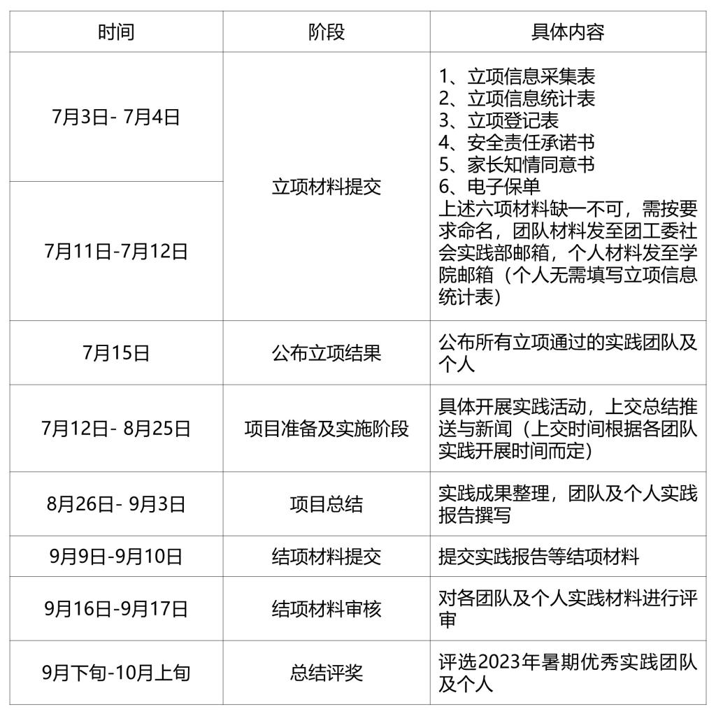(4)7月3日至7月4日为第一批立项材料提交时间,7月11日至7月12日为第二批立项材料提交时间,请实践团队或个人结合实际情况在相应时间段内将电子版立项材料发送至对应邮箱,若所提交立项材料存在问题,校区团工委社会实践部及各学院实践部将及时进行邮件回复,请及时关注邮箱,并将于7月15日公布所有立项通过的实践团队及个人。