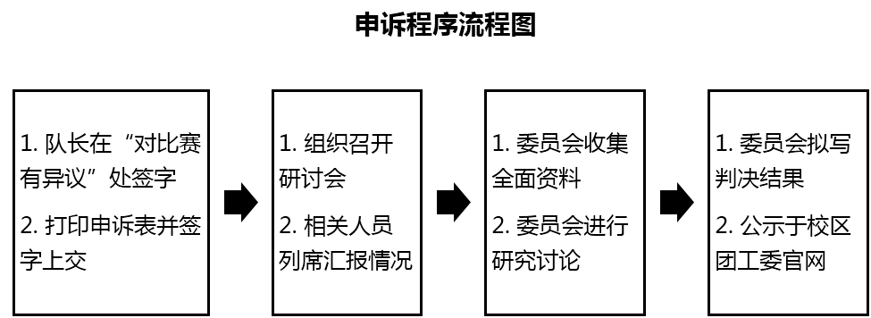 1、提出申诉:在体育联赛每场比赛结束后,对比赛结果或者比赛过程存在异议的,由队长在赛事记录表“对比赛有异议”一栏签字,并在比赛结束后次日15:00前打印填写《附件1:大连理工大学盘锦校区体育联赛申诉书》,由领队和队长签字后交至E02-303办公室。