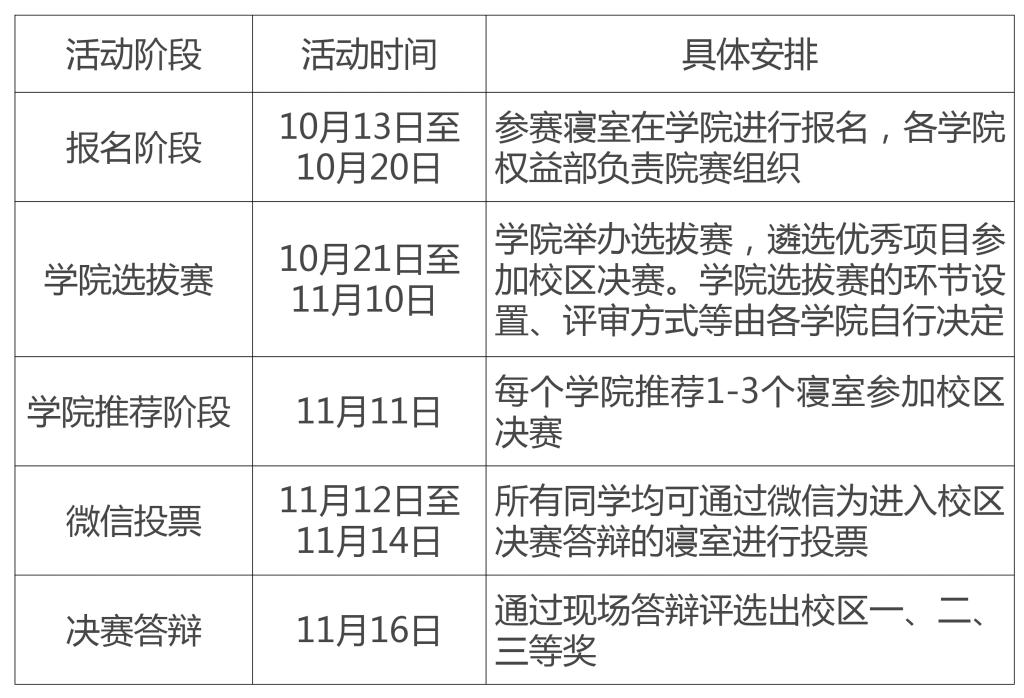 1、决赛答辩评分规则:每个寝室满分为20分,包括寝室整洁度10分,文化建设水平10分。