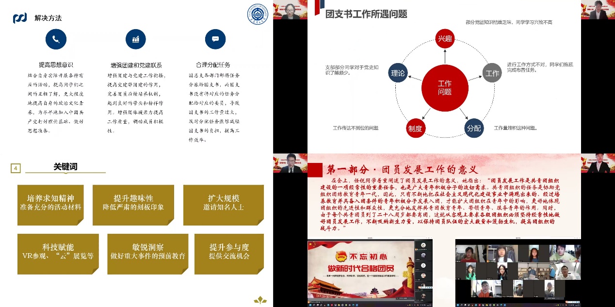 本次研讨交流大会以小组讨论、线上成果汇报的形式开展,15个小组围绕“凝练特色,打造品牌——团日活动形式与内容的创新之法”、“团支书如何有效地开展工作,从而提高团组织的吸引力与凝聚力”、“严把共青团员入口关,推进团员发展规范化——团员发展工作流程详解”、“喜迎二十大、永远跟党走、奋进新征程——主题团日活动策划方案”、“把论文写在祖国大地上——团支部服务青年科技创新的思考”五个主题精心准备,联系校区实际,提出了切实可行的方案。