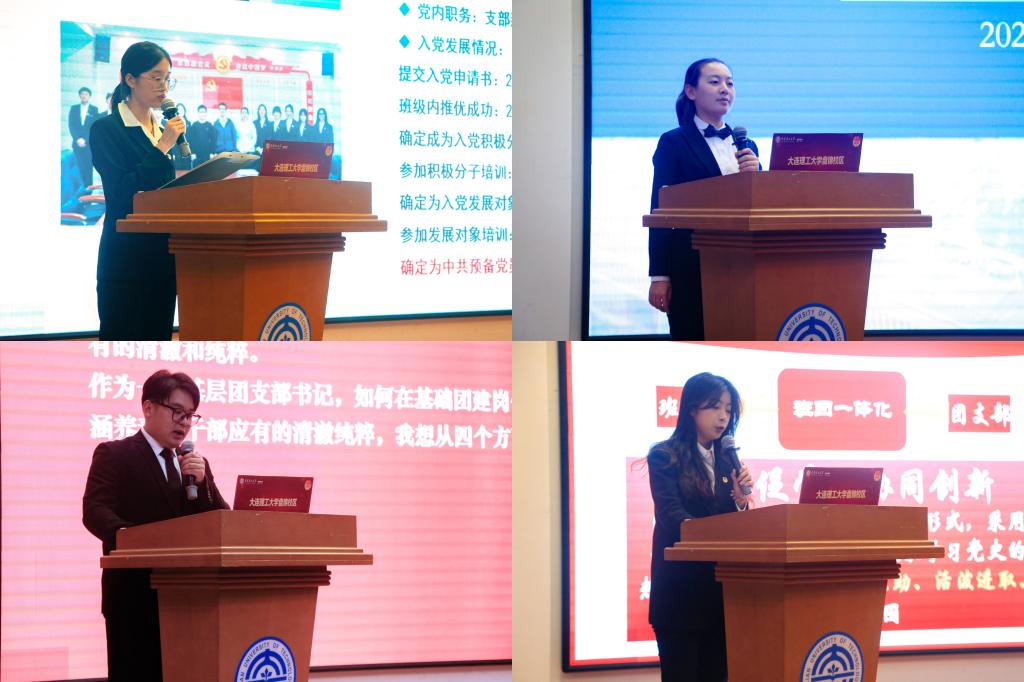 团支书作为重要的基层团干部,对团组织工作的顺利开展有着重要意义。评选现场,各候选人从思想、学习、活动等多个方面展现团支部事迹与个人风采,分享对于团支书工作的思考与感悟,展现出良好的思想政治素养、工作实操能力、表达思辨能力。现场评委对各位团支书从基本的团务知识、团支部建设问题以及个人情况等方面进行考察提问,以此对团支书们的综合能力进行评比。
