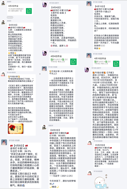 建党百年赤子心,共读经典同筑梦。为迎建党百年,3月26日,校区学生会学习部“献礼建党百年读书打卡”活动开启征程。活动分为21天入门级,50天进阶级,100天挑战级三种模式,鼓励参与者依据个人情况进行选择。目前,21天入门级活动已于4月15日圆满完成,日均打卡率高达80%,进阶级与挑战级仍在如火如荼进行中。