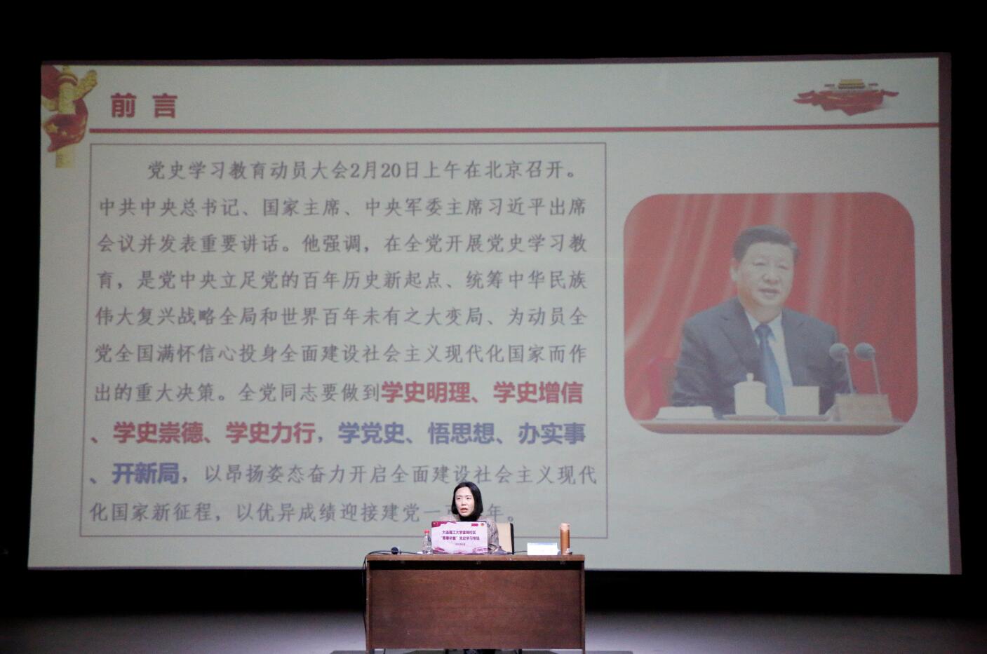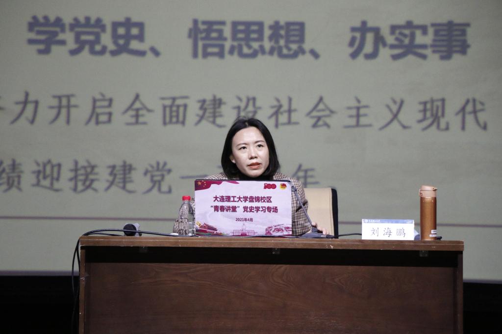 刘海鹏老师从“全面了解中国共产党百年奋斗的光辉历程”、“准确把握党史学习教育的总体要求”、“不忘初心跟党走,青春建功新时代”三个方面进行了阐述。她讲述了中国共产党百年奋斗的光辉历程,带领同学们详细了解“学史明理”“学史增信”“学史崇德”“学史力行”的党史学习教育具体要求,勉励同学们要强化理论思维、筑牢信仰之基、弘扬优良传统、做到知行合一。