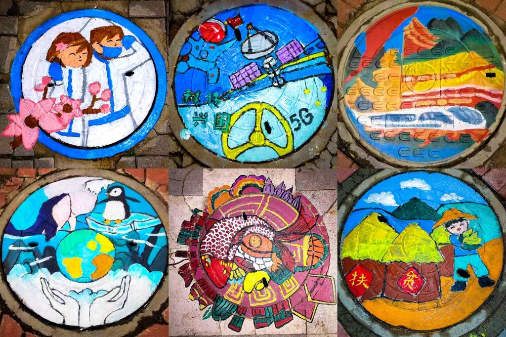 不同于日常纸面绘画,井盖长年累月暴露在地面上,灰尘以及凹凸不平的表面给井盖彩绘增添了不少难度。从开始清洁、描网格,到按照线稿起形、丙烯颜料上色,再等待颜料风干、喷上喷雾提光,完成一个井盖绘画需要4个小时的时间,但志愿者们都始终保持着很高的热情。天宫一号、复兴号高铁、港珠澳大桥、C919大飞机、脱贫攻坚、抗击疫情、生态文明建设、“一带一路”倡议等一系列浓墨重彩的展现新时代伟大成就的图案跃然在井盖上。