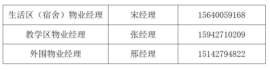 附:学校教学、生活、外围三个区域分别由三家不同物业管理,同学们如有特殊情况可以联系相应的负责人。