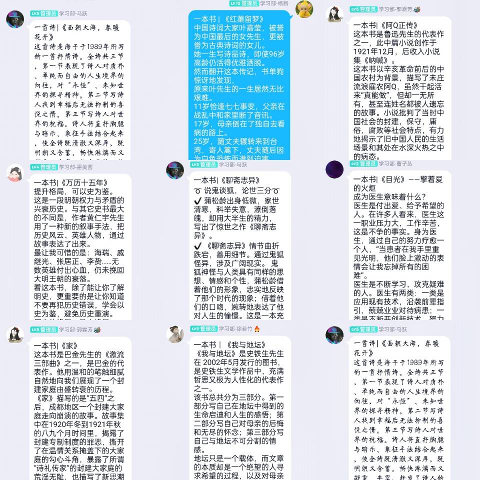 横看成岭侧成峰,雅诗奇文共欣赏。午时十二点,校区学习部分享文化经典,荐古今中外书籍,品天南海北名文。读仓央嘉措,悟爱之美;诵三毛之诗,感生之悦;翻《我与地坛》,领略不屈生命之韧劲;品《家》,体会挣脱枷锁的力量;赏《万历十五年》,兴衰之中窥至理真谛;阅《红蕖留梦》,苦难之间造诗意灵魂……分享如一条无形的绳,绳的一端满心欢喜,另一端同样欢愉惊艳。