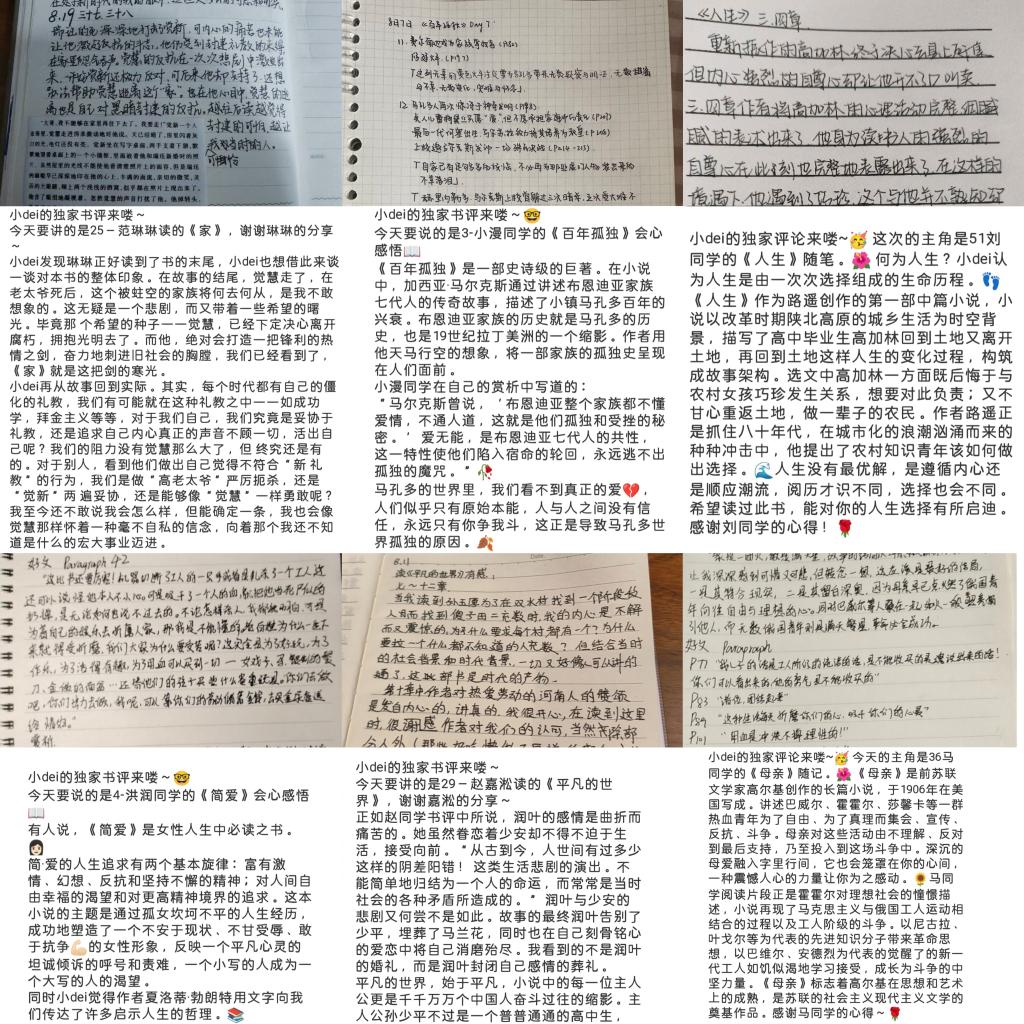人生之乐,莫过得一知己;读书之乐,莫过书友随行。文字本无声,一份份陪伴与鼓励却赋予了它别样的温度。每日学习部成员都会认真批改同学们提交的作业,每一点心得都有回响,每一个疑问都有研讨,每一丝情绪都有关切。每日的独家评论中,值班人员也会和同学们进行探讨交流、思维碰撞,于交流中窥探真知灼见,于共享中点染缕缕书香。