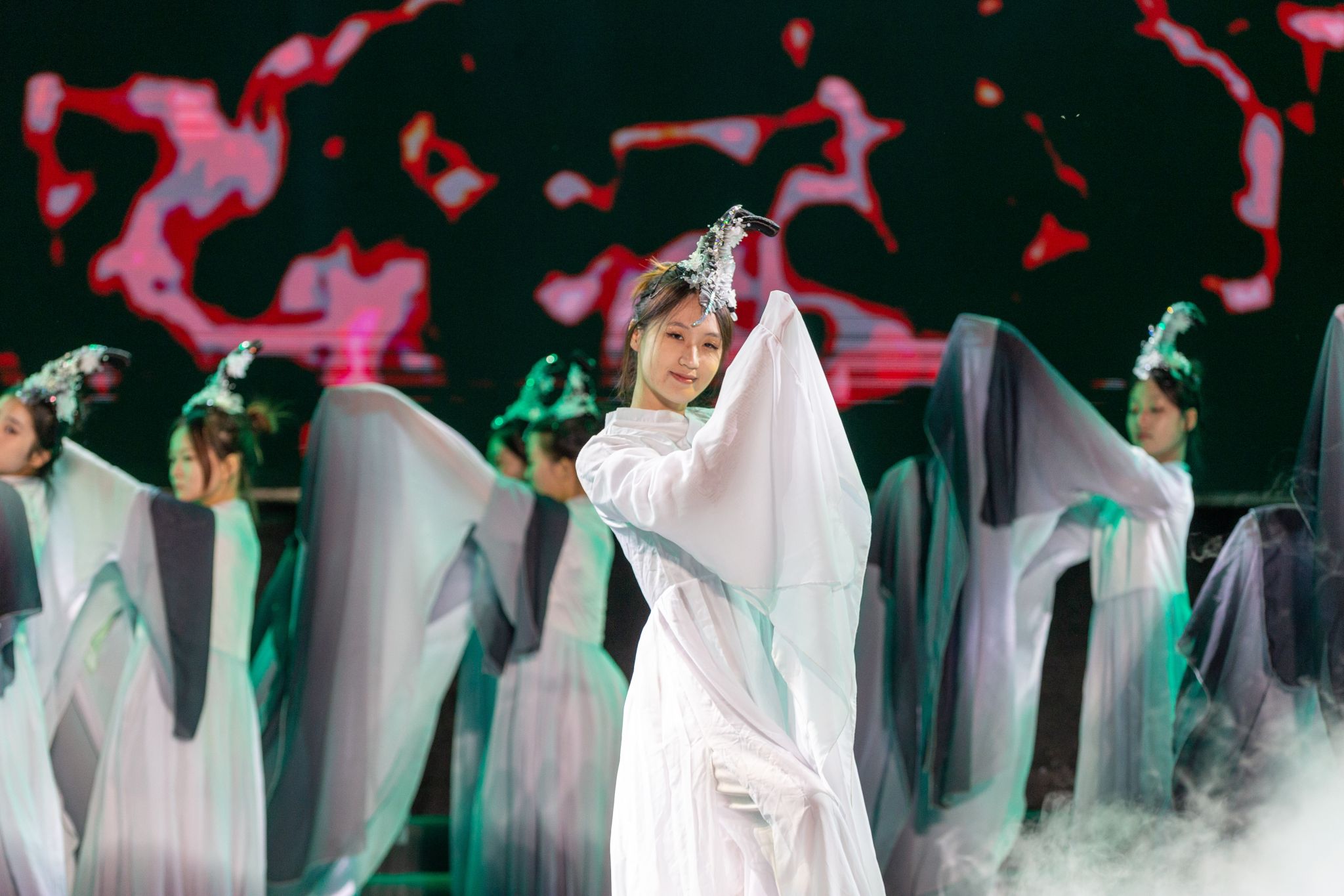 舞蹈《在水一方》将长袖舞与《诗经》相结合,在轻盈流畅的舞姿间,诉说着一段动人的诗意故事,展示了对中华传统文化的致敬与传承。社团表演《青春连理》着重表现社团文化、展示社团风采,是校区社团对新生的一次问好。校区教师代表倾情演绎的诗朗诵与歌曲《致敬十年》,饱含温情与祝愿,在阵阵欢呼声中将晚会的气氛推向高潮。随着《青春就这YOUNG》的欢快旋律,迎新晚会进入尾声。