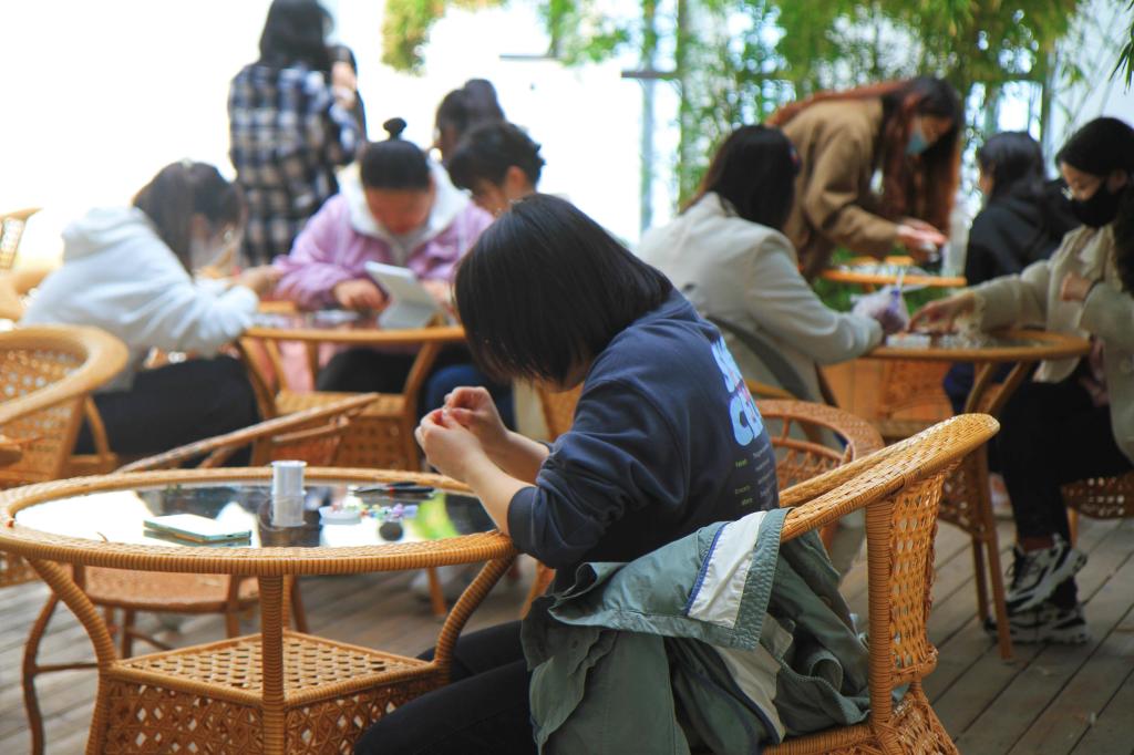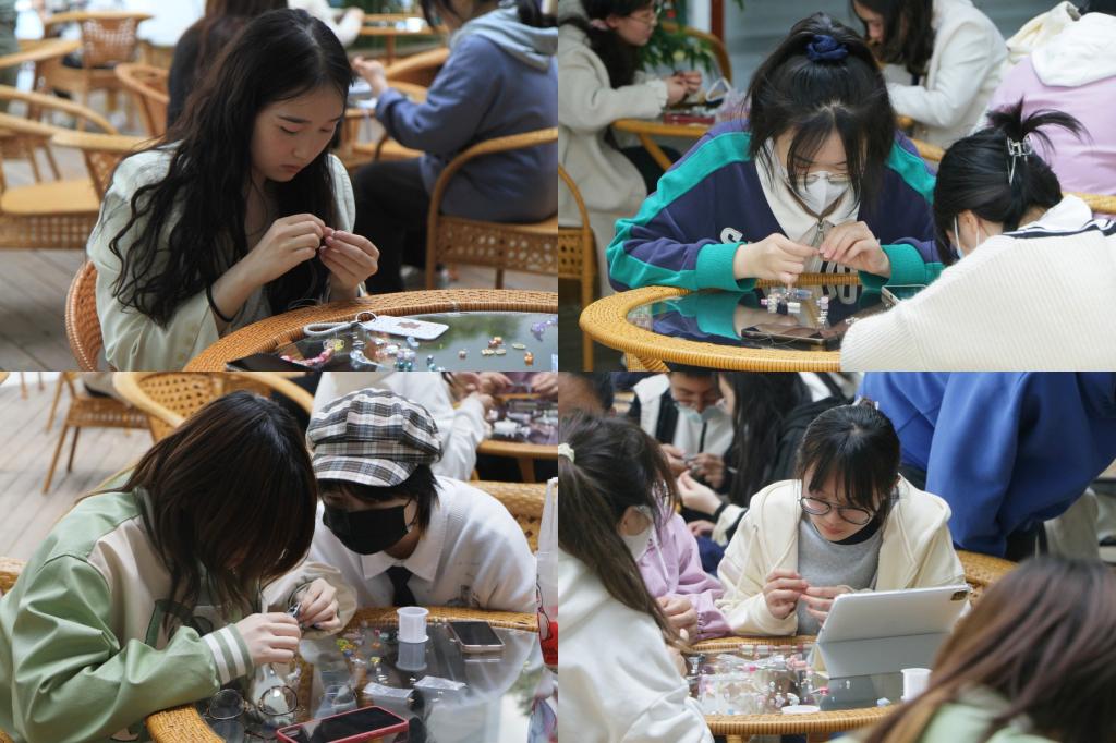 制作过程中,光与影的交织,手指间的跳动,一幅幅温馨友好地画面展现:同学们互相交换着自己心仪的串珠,分享着自己独特的构思与创作,快乐与美好就如同烟花炸开般散落在大厅里,在这个温馨的午后,我们收获的温暖可抵岁月漫长、美好可抵艰难时光。