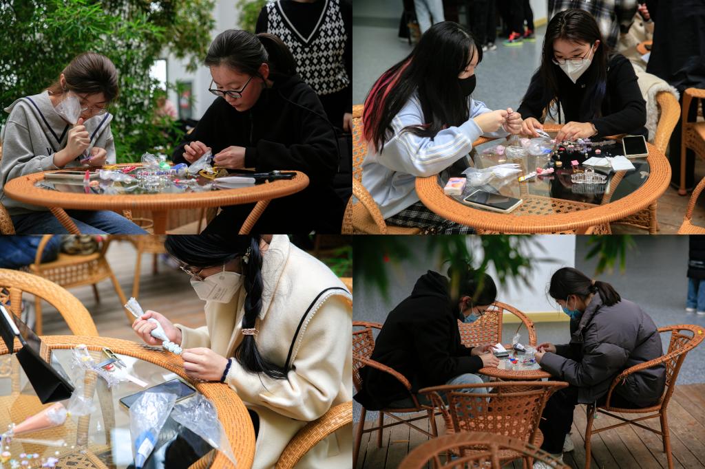 五彩缤纷的奶油胶,让人应接不暇。既有亮眼的明黄,又有沉稳的深蓝;既有迷人的粉红,又有清新的草绿……同学们沉浸在色彩的海洋中,肆意畅游。令人惊喜的不仅是那色彩斑斓的奶油胶,更是同学们充满创意的设计和灵巧能干的双手,将一个个发夹赋予生机。以多彩的奶油胶打底,再缀以精妙的装饰,同学们一边动手制作,一边沟通交流,各种色彩、各种创意交织汇聚,绘出一幅色彩热烈、感情浓烈的青春之画。