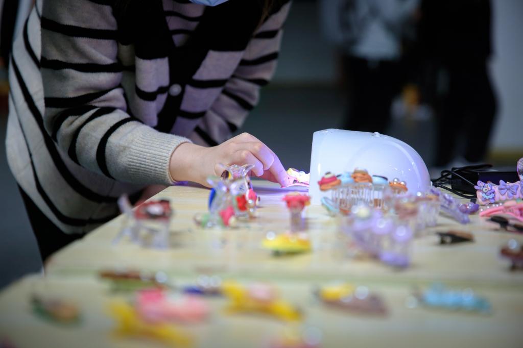 丝滑的奶油胶涂抹在简单的发夹上,一勾一划,尽显同学们的奇思妙想。绚丽的颜色彰显青春的热烈,精巧的配饰丰富设计的内涵,在这场由创意与双手配合完成的手工盛宴里,一个个精致美丽的奶油胶发卡让一份份心愿得以寄托。蕴含着美好心愿的奶油胶发卡将会在后续的义卖活动中化作一股股暖流,为盘锦市养老院的老人们送去爱心与温暖。