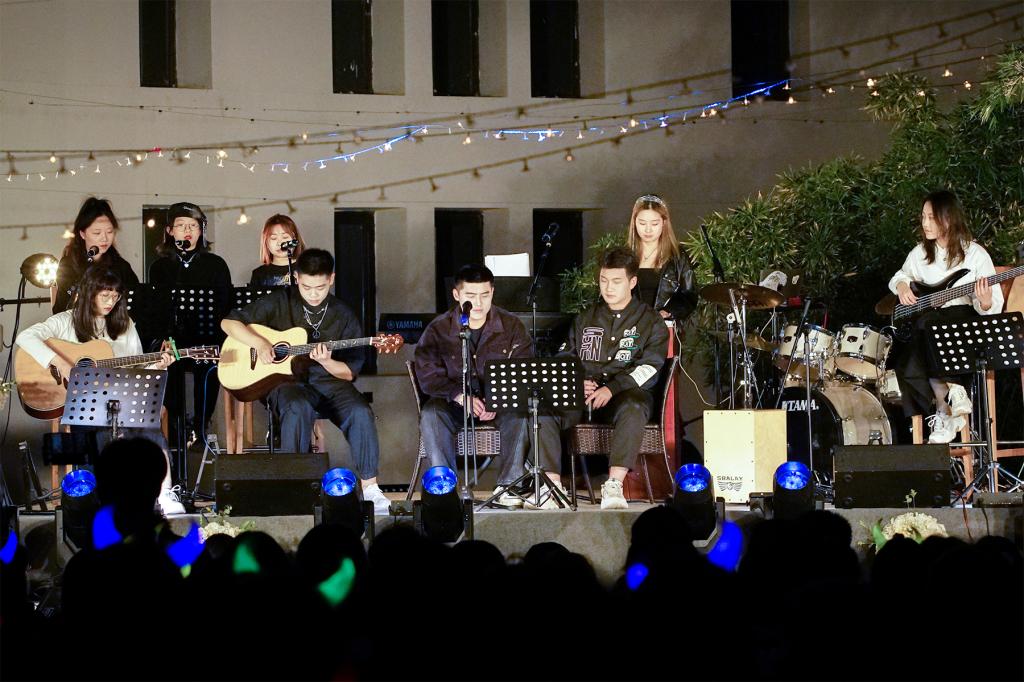 随着一段悠扬的钢琴声响起,音乐会的大幕徐徐拉开。跳动的鼓点、低沉的贝斯、娓娓动听的歌声与E02郁郁葱葱的竹林和灯光,配合着台下同学的荧光棒与闪光灯,共同组成了华美的乐章。