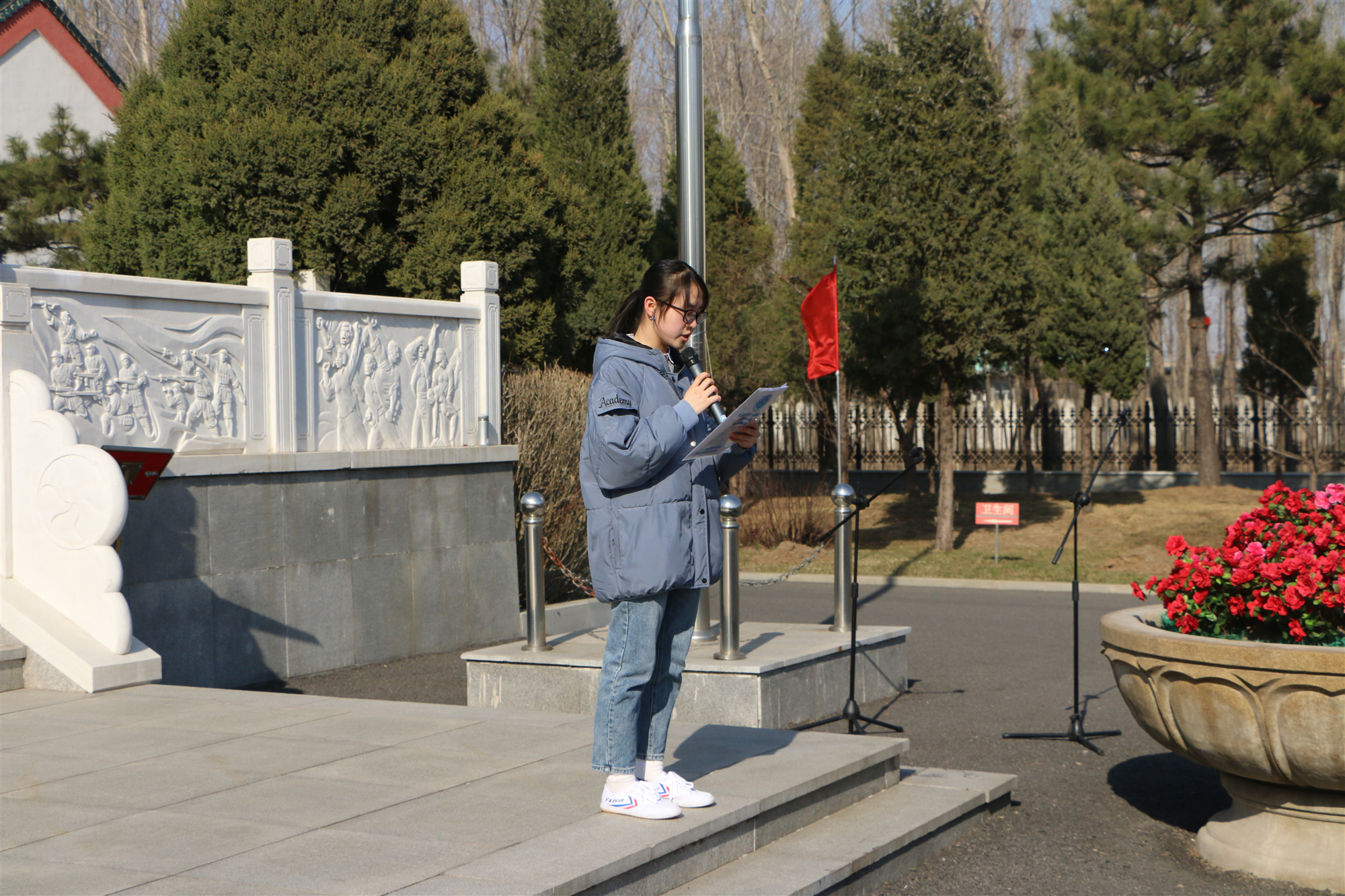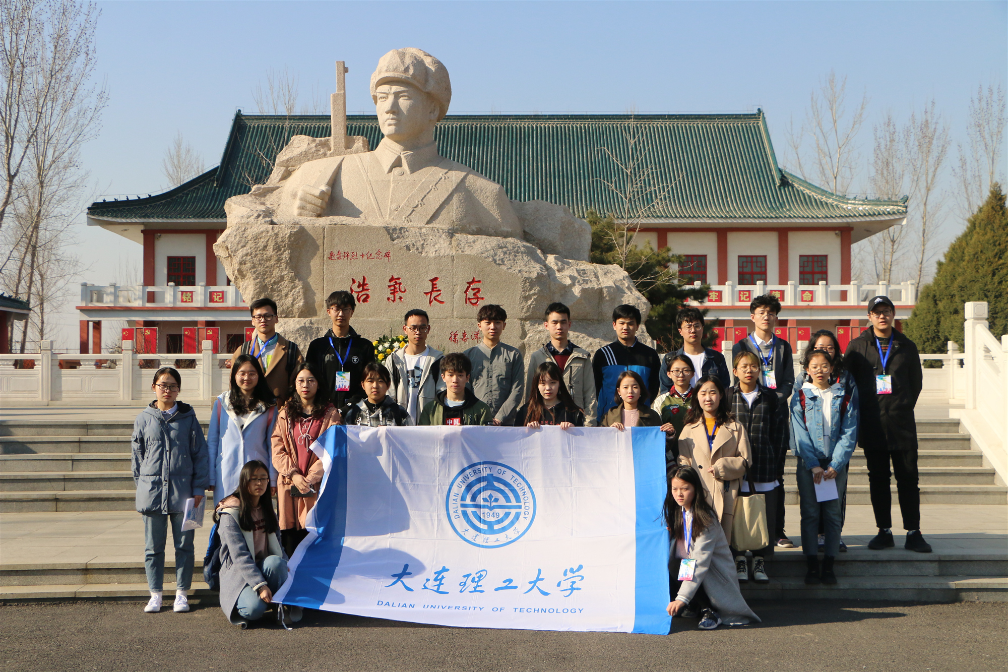 “自古辽水龙盘地,皆有烈士血染成”,进入陵园,直面学员们的是一块巨大的无名烈士碑,上书“浩气长存”四个大字,一尊无名烈士塑像伫立在碑上方,仿佛注视着前来祭奠的人们。在烈士碑前,学员们进行了纪念仪式,在庄重的默哀之后,由学生代表王欣欣进行了发言。