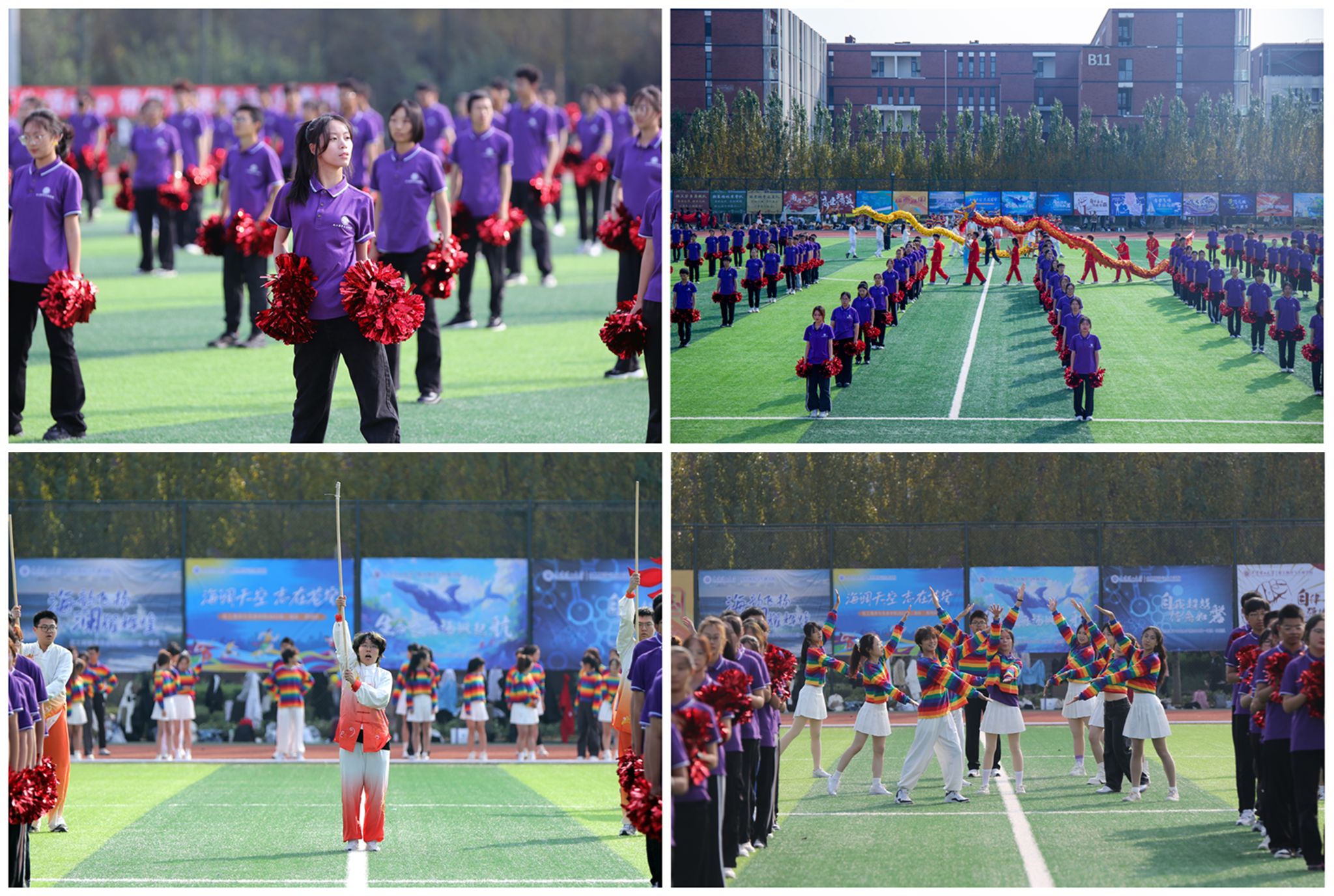 恰逢七五华诞,青春献礼祖国。由校区大一新生带来的啦啦操表演,尽显青少年蓬勃的朝气和活力;蛟龙出海上下翻飞、刀剑出鞘熠熠生威,中华传统武术表演精彩纷呈;青春活力的舞蹈将开幕式表演推向高潮。